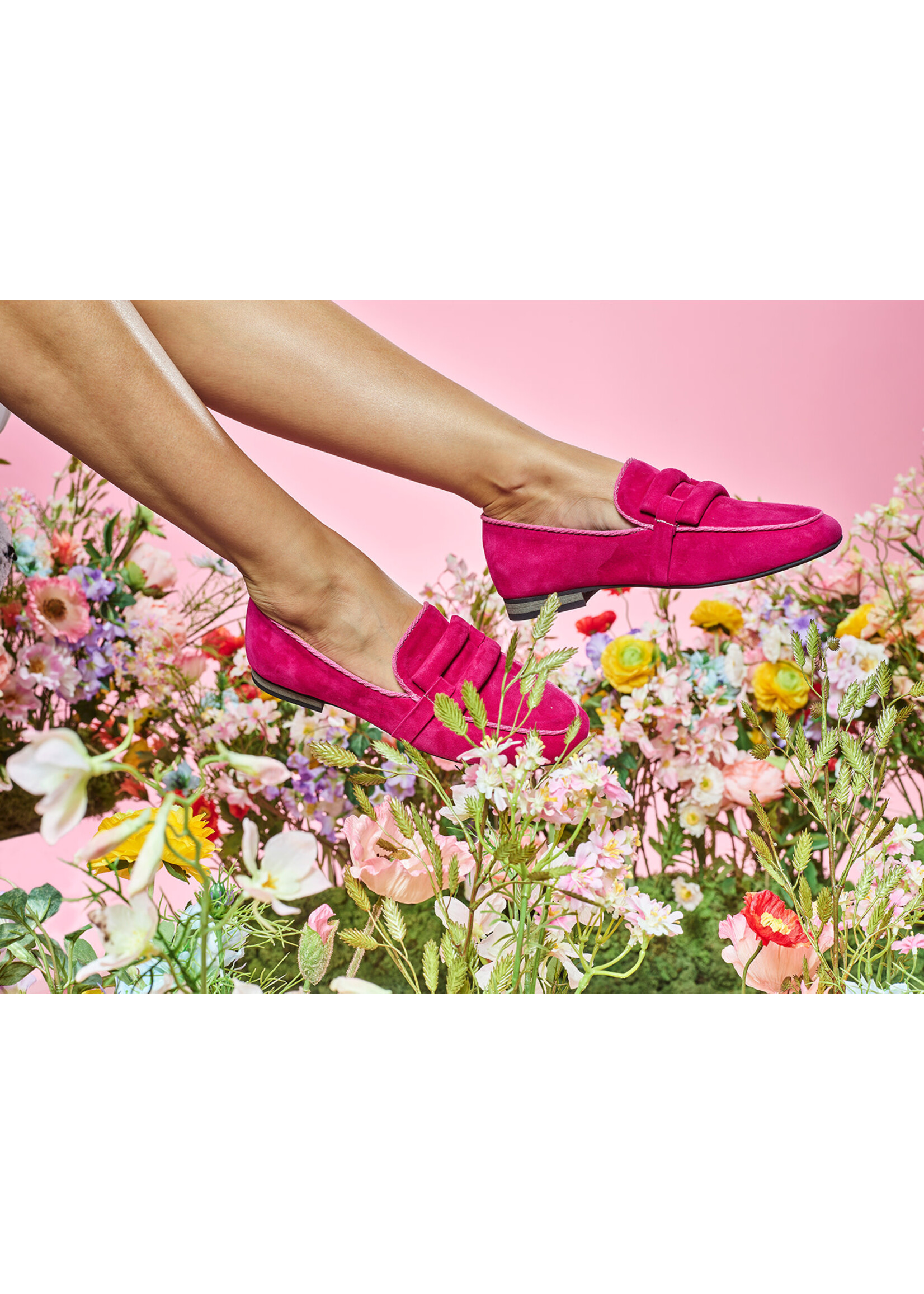 De loafer uit suede is afgewerkt met een gesp bovenaan en een ronde top.